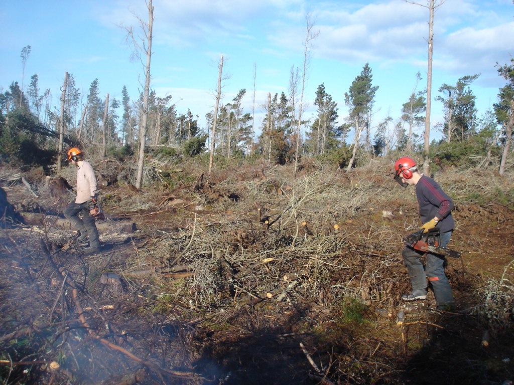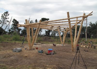 What was particularly special about this project was that the material used was from Scots Pine trees that had been planted by my father. They had been growing in the wild garden next to the old sanctuary for about 60 years until they were internally cooked by the intense sanctuary fire which resulted in partly charred heart wood. It was these trees that were felled in April 2022 and dragged by the FHT tractor up to Wilkies Wood to be sawn into 50mm thick planks by a hired portable sawmill. They were then transported to be stored and seasoned next to the Findhorn Foundation’s gardeners tool shed.